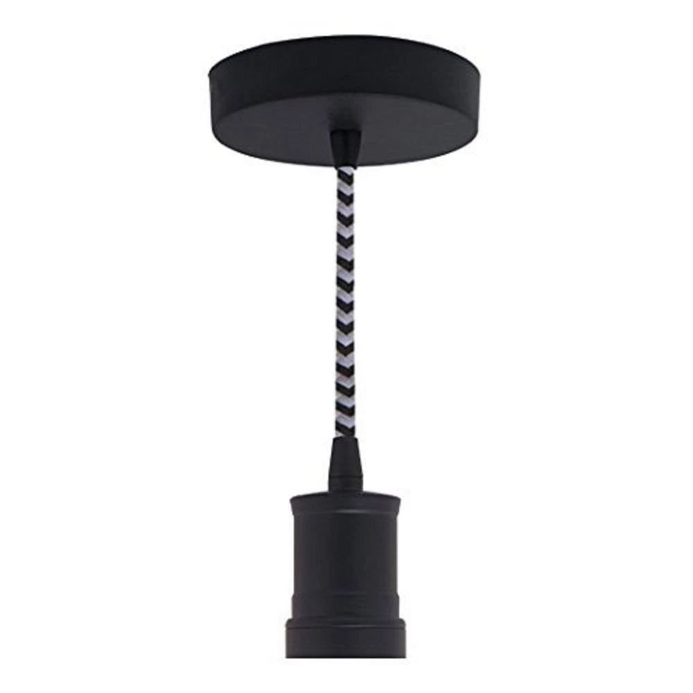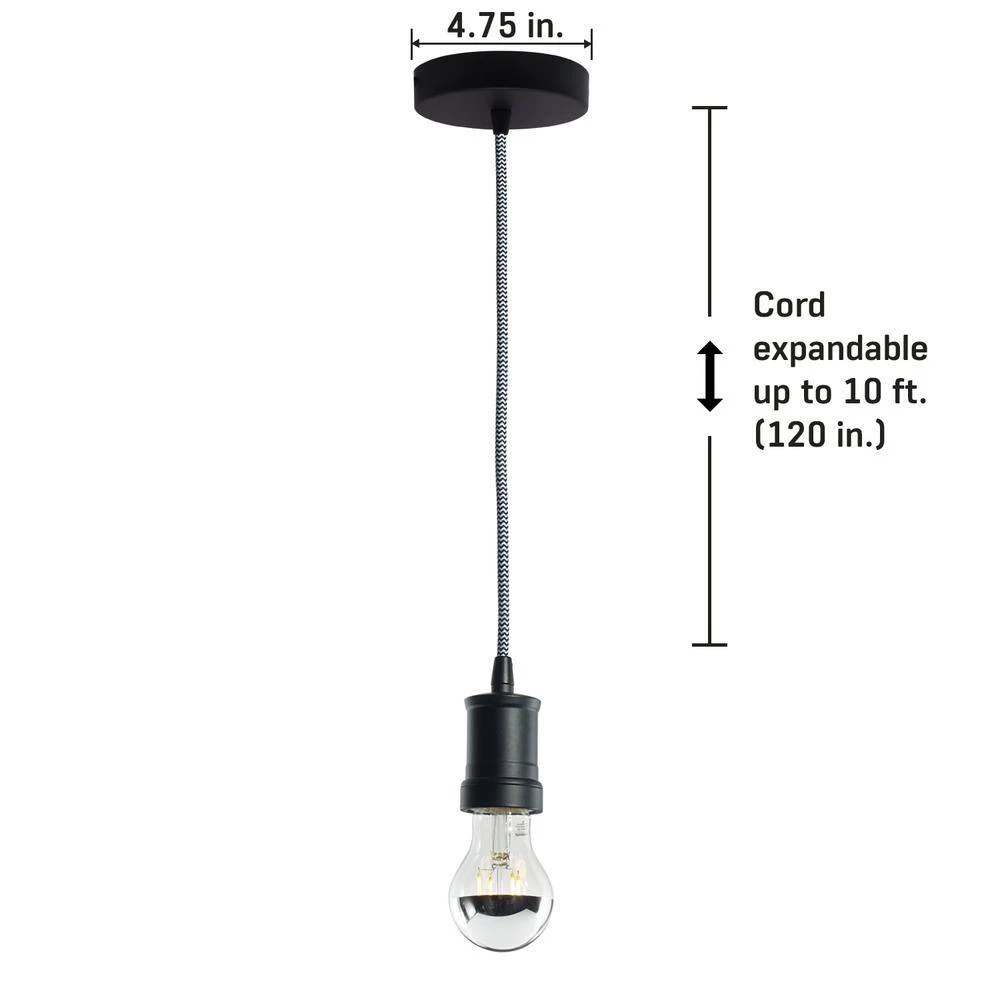 Bulbrite contemporary pendant – Black socket and canopy with 10′ Black and white chevron cord Bulbrite contemporary pendants come in a variety of finishes and cord colors. With Black, white, gunmetal and warm gold finishes, these pendants bring a detailed and clean design to your space. Combined with Bulbrite’s LED 5W A19 Filament Half Mirror Light Bulb the result is flawless and bring life to any room,