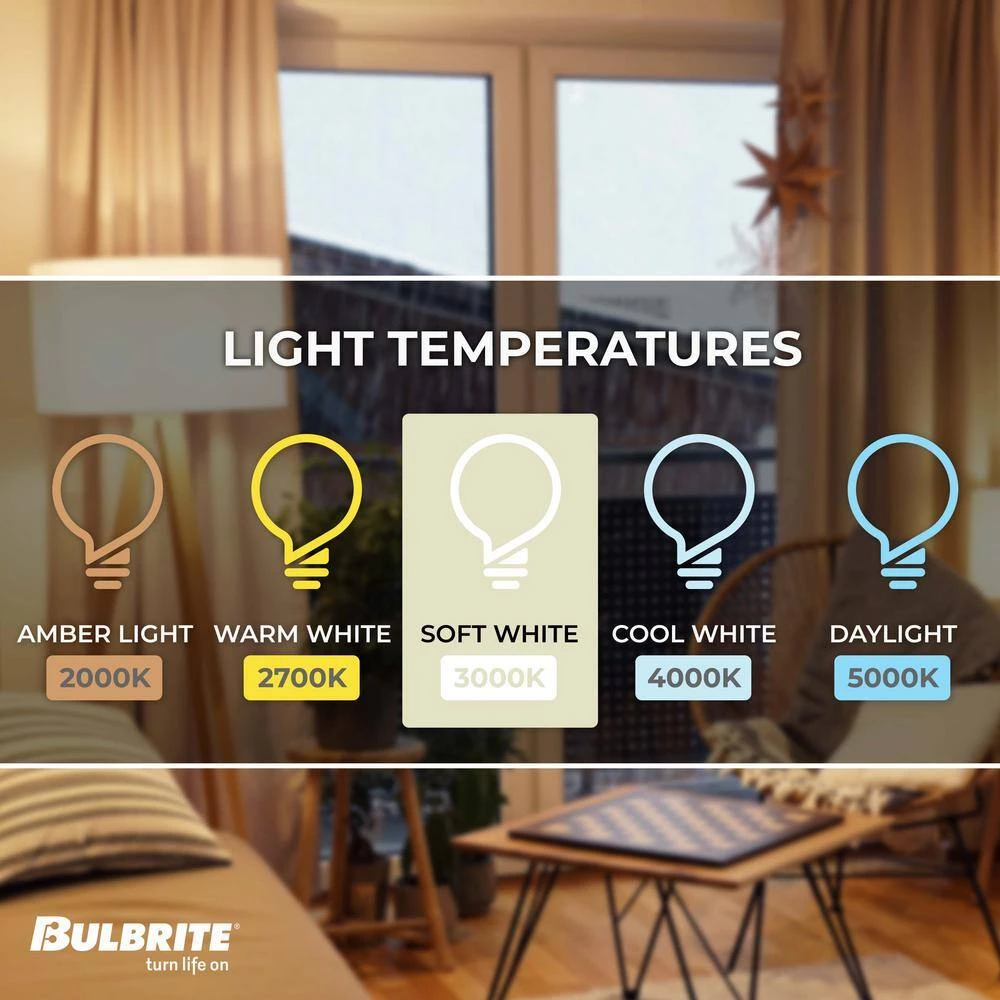 - Warm white light: with a Kelvin score of 2900 each, these bulbs emit a Warm white light, this rating means your lamp or ceiling fixture will emit a perfect amount of light that is not too dim and not too harsh, they’re also fully adjustable meaning you can control the ambience of your room.