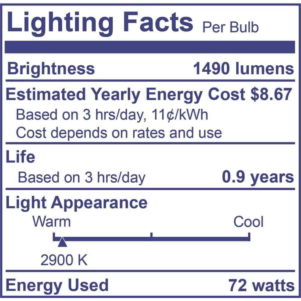 - Long lasting: these 72-watt bulbs have 1490 lumens and a rating of 100 CRI, each of the 12 bulbs included will last an estimated 1,000 hours. Compare to the standard 100 watt incandescent bulb when considering lifespan and brightness, the maximum overall length is 4 in. and bulb diameter is 2.375 inches.