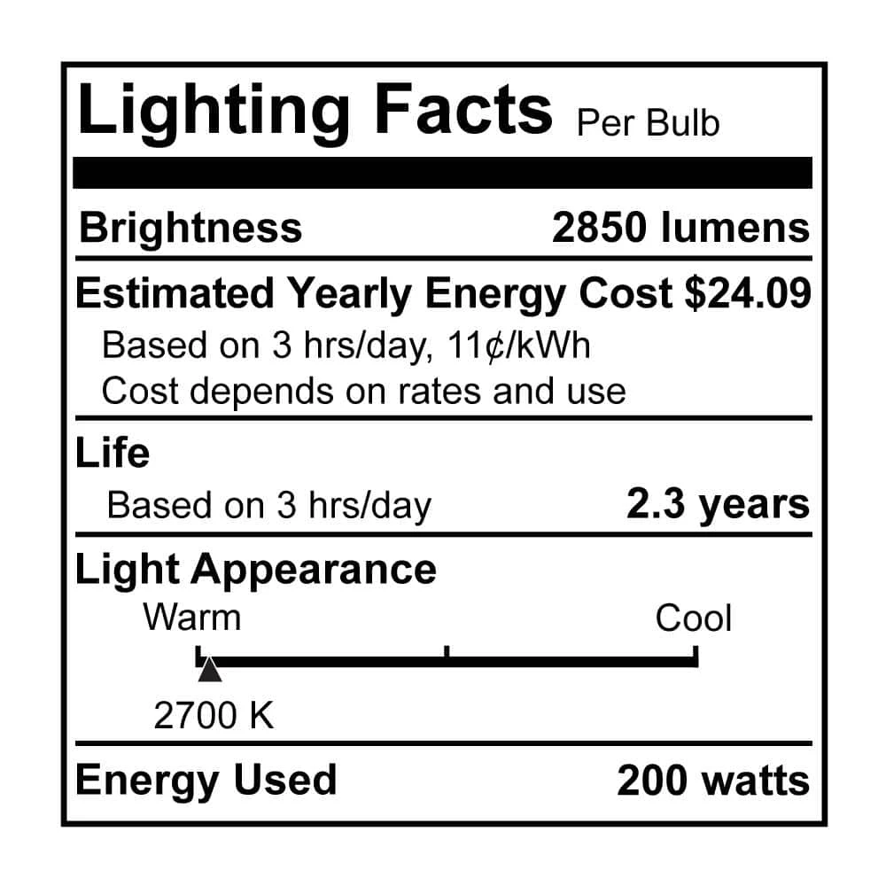 - Specifications: 200-Watts, 2850-Lumens, 100 Cri, 2500-hour average rated life, medium screw (E26) base, maximum overall length is 6.25 in. and bulb diameter is 2.875 in.