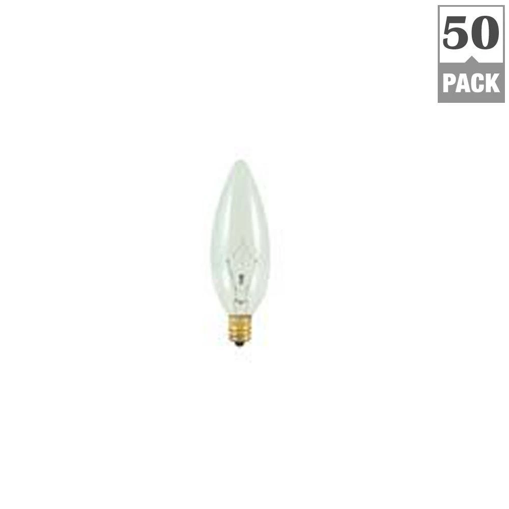 - 50-PACK: Bulbrite torpedo shaped incandescent chandelier bulbs add the finishing touch to any chandelier or fixture. Provides clean Beautiful light with any fixture, enhancing the surroundings of your home. Make any home improvement project easier with this 50-Pack of bulbs.