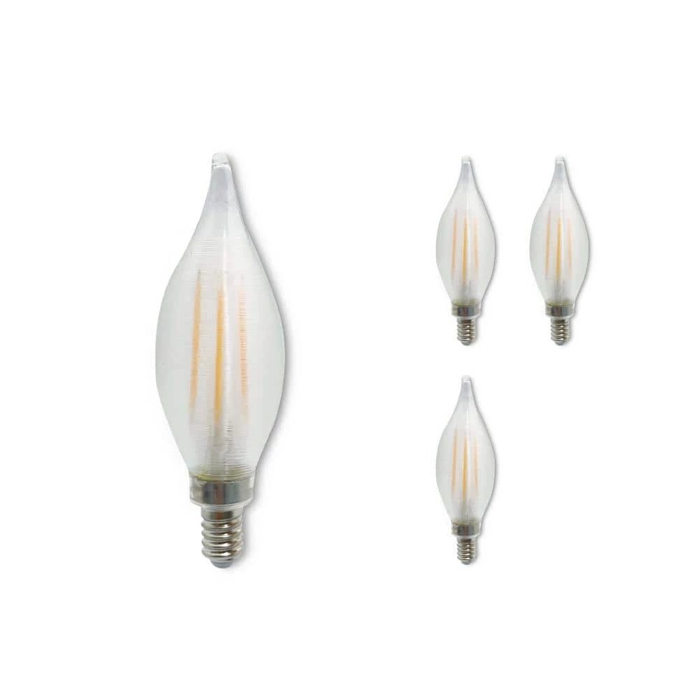 - Specifications included in this package are 4, C11 LED bulbs with a satin finish, each bulb is 4-Watt and has a standard E12 screw base these bulbs are long lasting and fully dimmable