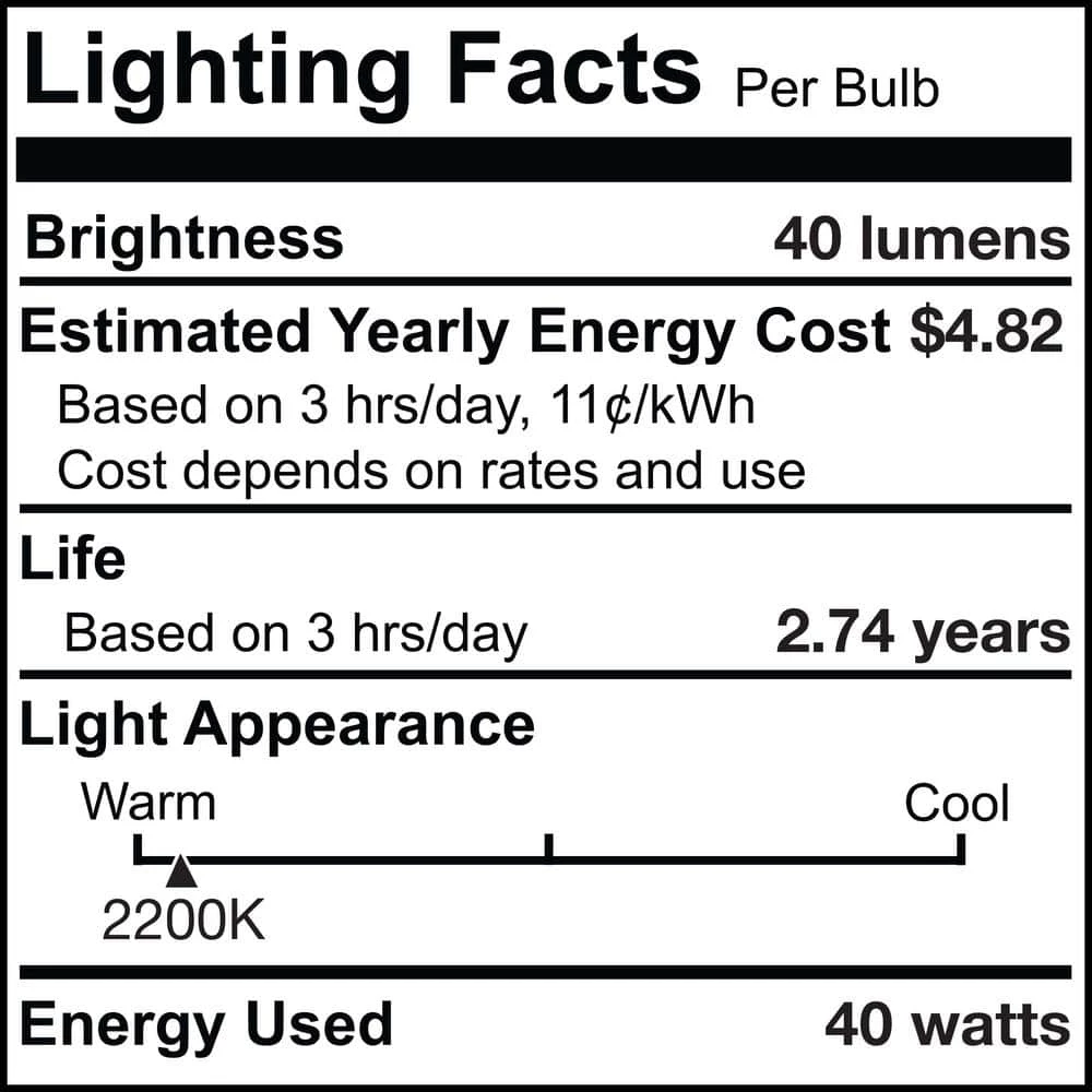 - Specifications: included in this package are four individual 40-watt incandescent bulbs, each bulb is a T8 candelabra style with an E12 screw base. Housed within their glass globes is an antique thread filament for a nostalgic look, they are fully dimmable.