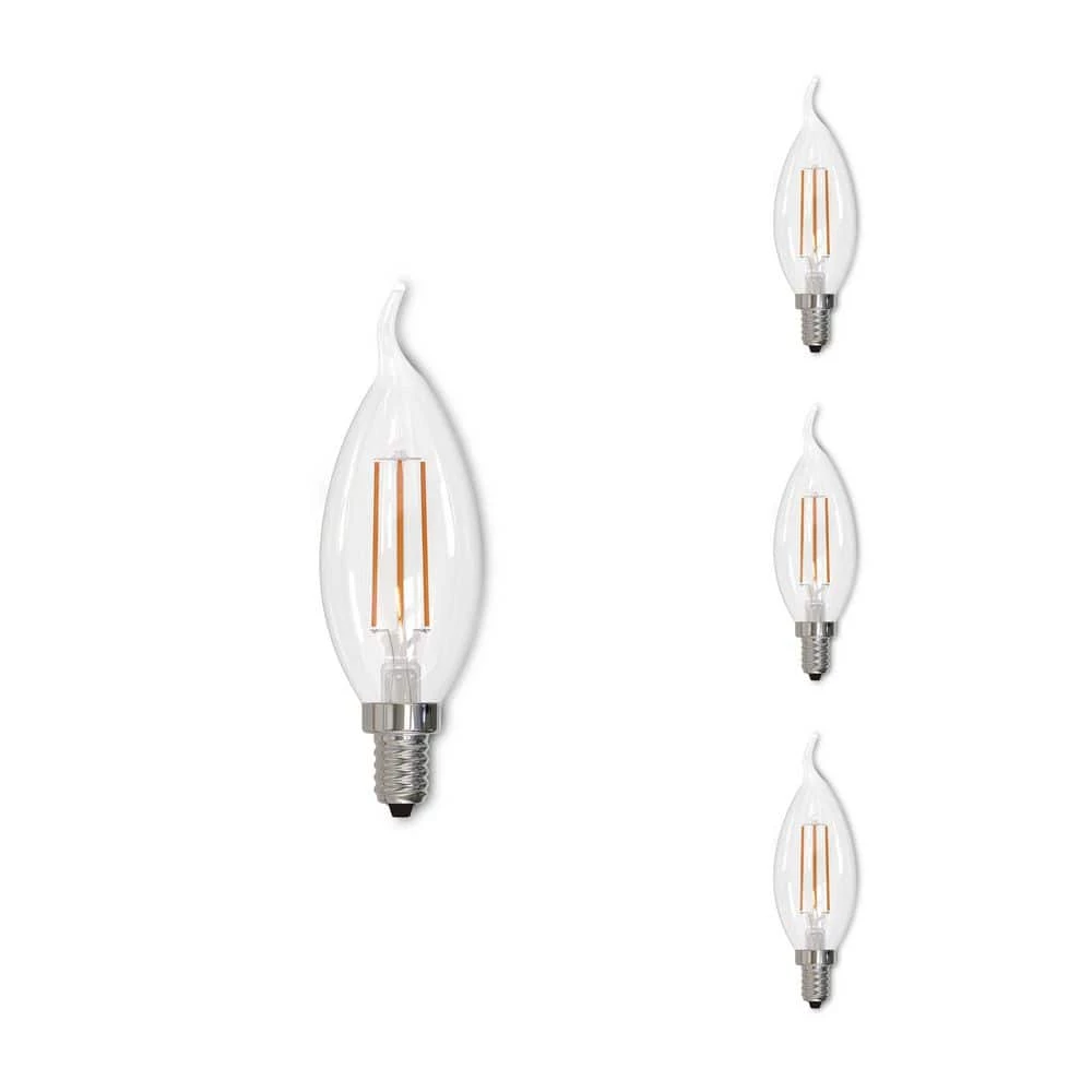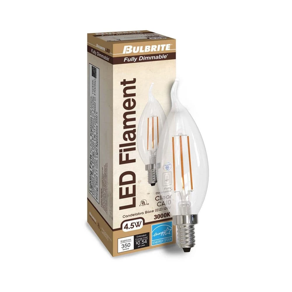 - SPECIFICATIONS: this is a 4-Pack of 4.5 watt dimmable CA10 candelabra bulbs with clear LED filaments, perfect for use in any chandelier or decorative candle like fixture, each bulb is made of clear glass with a screw base in size E12. Bulbs emit 350 lumens, 3000K and 90 CRI.