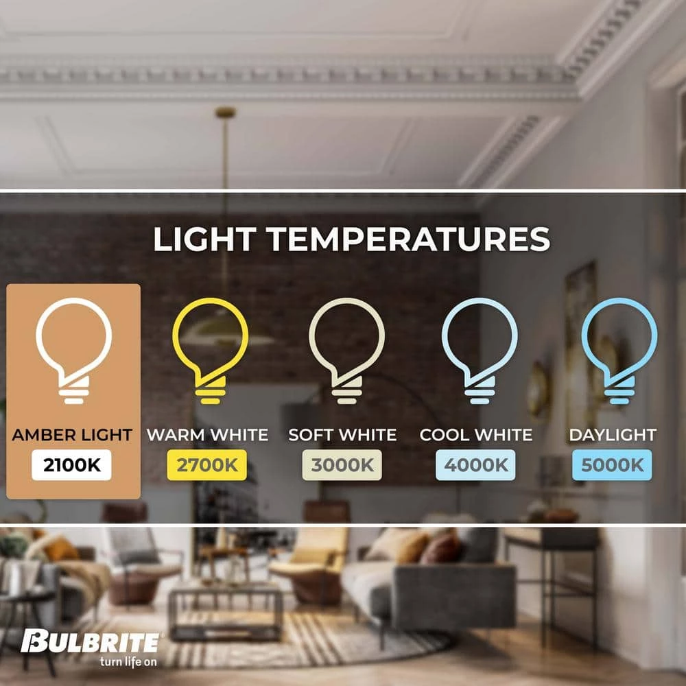 - Soft white light: with a Kelvin score of 2200 each, these bulbs emit a Warm white light, this rating means your lamp or ceiling fixture will emit a perfect amount of light that is not too dim and not too harsh, they’re also fully adjustable meaning you can control the ambience of your room.