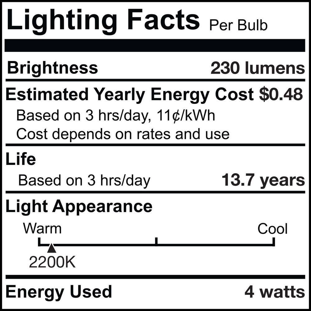 - Long lasting: LED technology makes for a Long lasting, eco friendly bulb that is sure to outlast and outperform your halogen and incandescent counterparts, each of these bulbs is just 4 watts, making it the equivalent of a 40 watt incandescent bulb for a fraction of the energy usage.