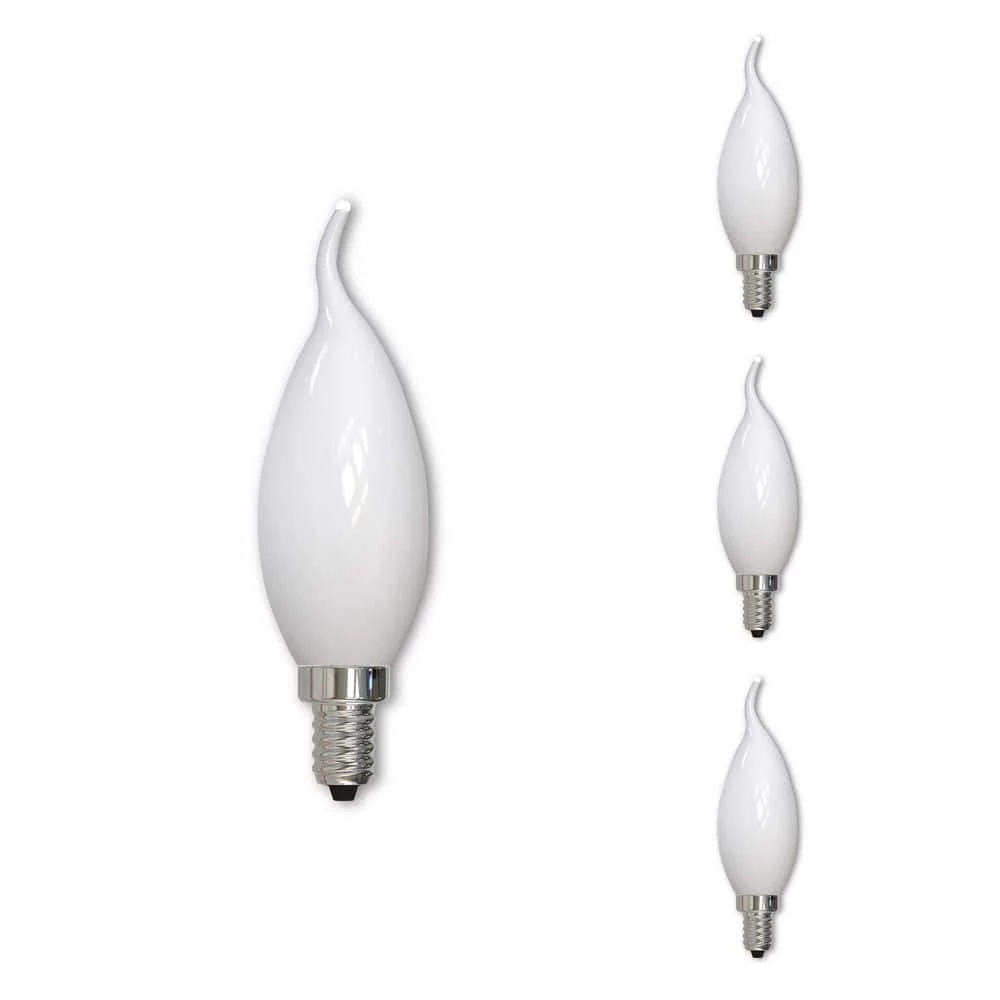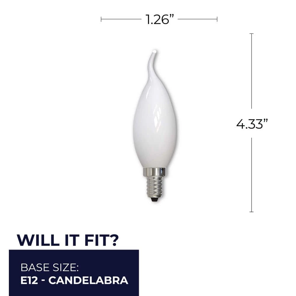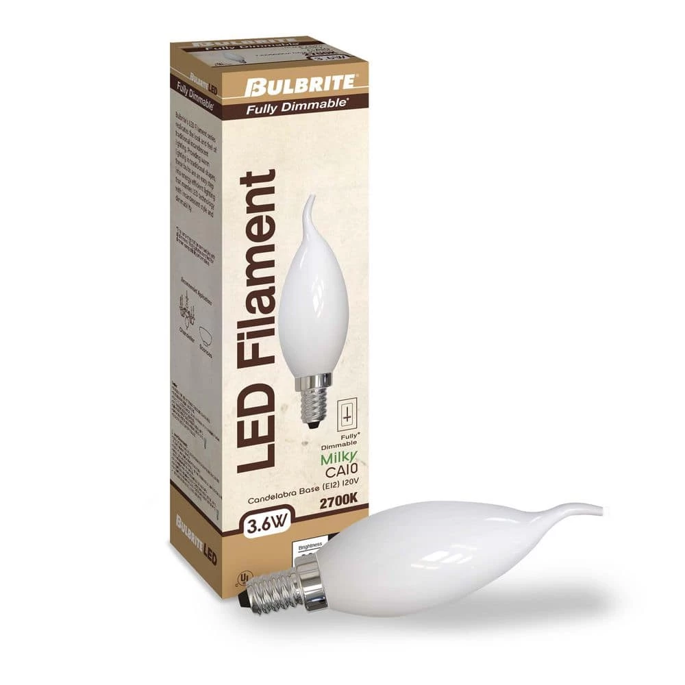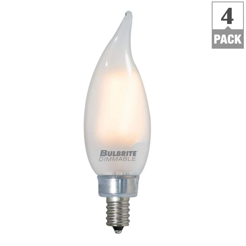 - Specifications: included in this box are four individuals 5-watt dimmable bulbs, each bulb has a CA10 filament and is rated at 2700 Kelvin. These bulbs are the equivalent of a 40 watt incandescent, they have a Frosted finish and a standard E12 screw base. Decorative candle shape.