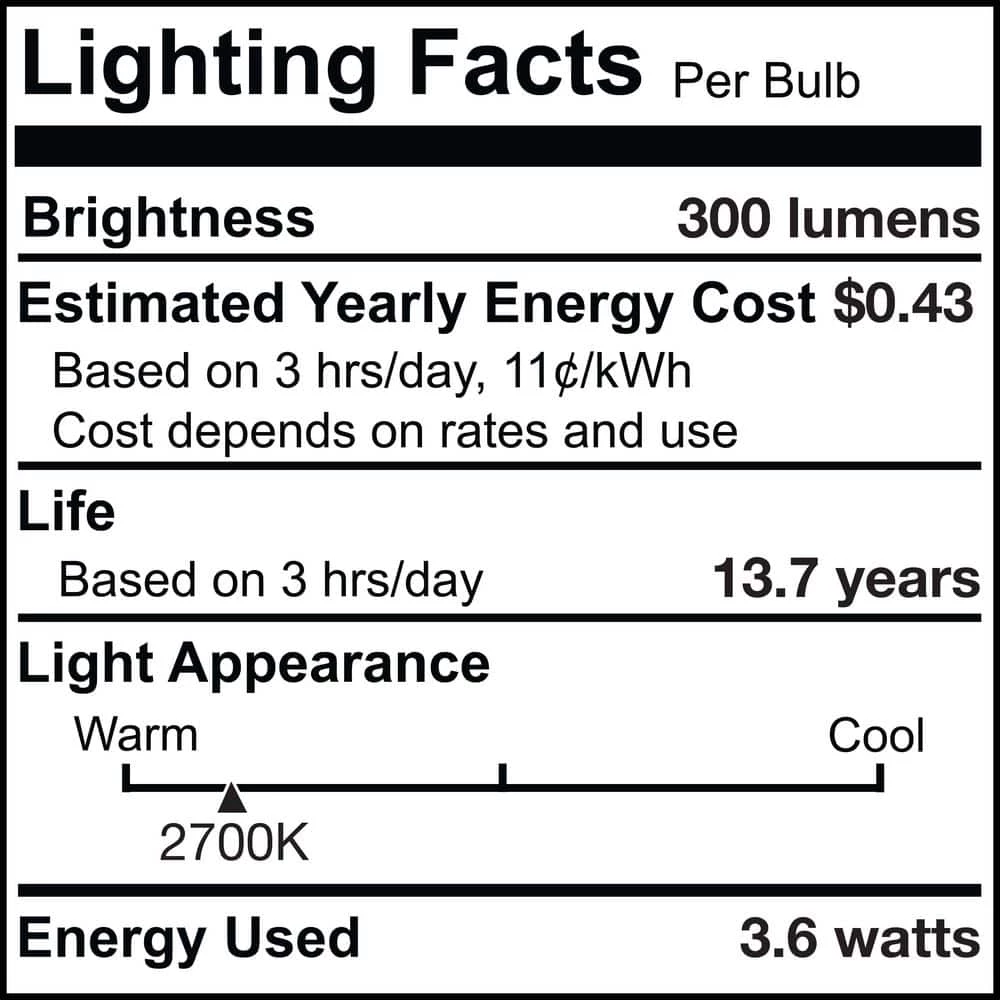 - LED TECHNOLOGY: You’ll experience an estimated 90 percent Energy Savings when compared to the incandescent equivalent of these bulbs, each LED bulb is estimated to last 75 times longer than their incandescent equivalent. These bulbs are fully dimmable as well.