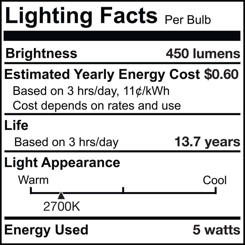 Cast the perfect warm, white light throughout any room of your home with these class pear-shaped glass bulbs. Each LED bulb is long lasting and compatible with your dimmer technology and fixtures. Included in this package are two, 5-watt dimmable LED bulbs. Each A19 bulb has a clear filament and an E26 standard screw base. At 450 lumens, 2700K and 90 CRI they offer low wattage and warm white light in a small package.