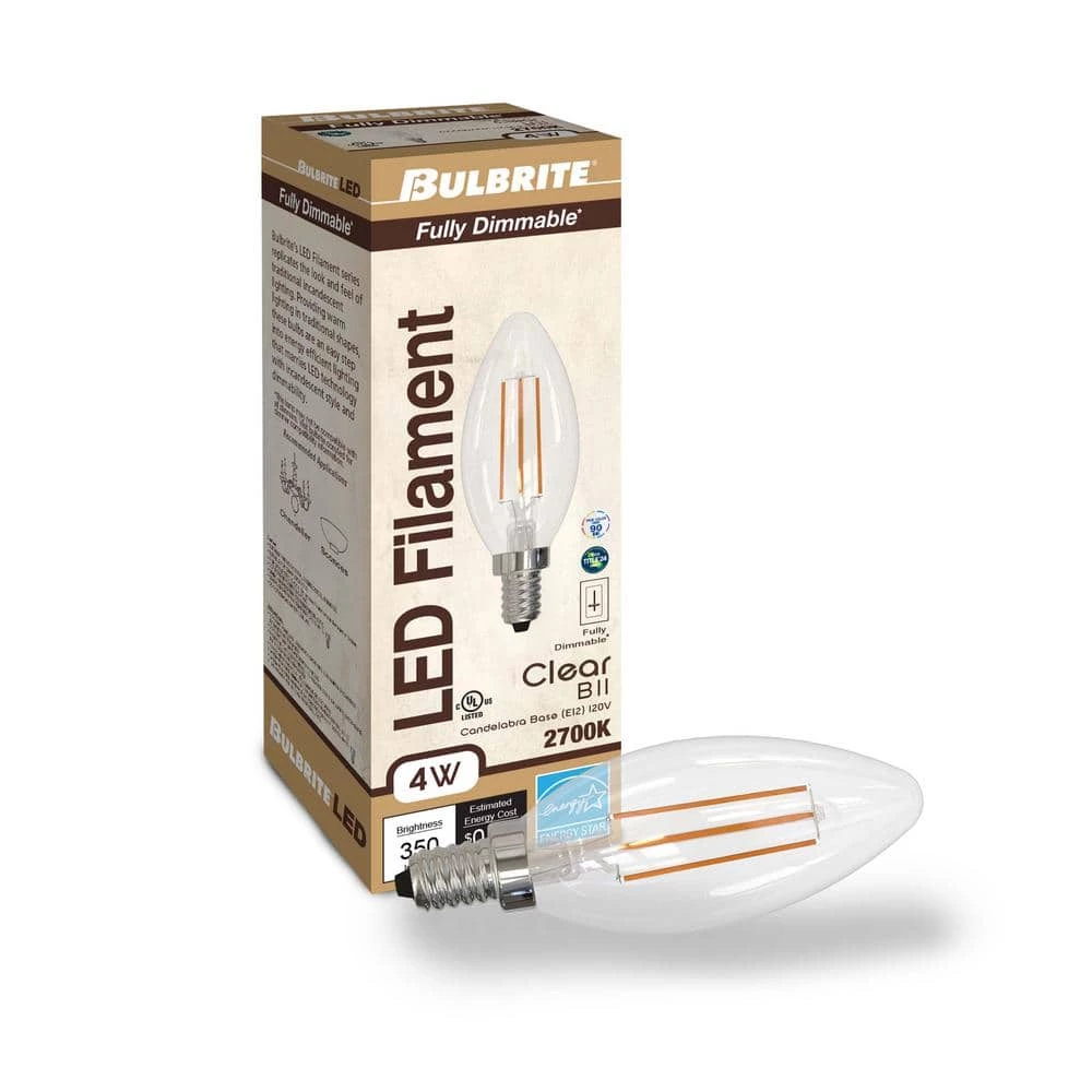 - Specifications: included in this package are four individual LED bulbs, each B11 bulb has an E12 screw base, each bulb is 4 watts, 350 lumens and 2700K. These bulbs are fully dimmable with a clear glass globe. Dimensions are 9.8 x 2.8 x 1.4 inches.
