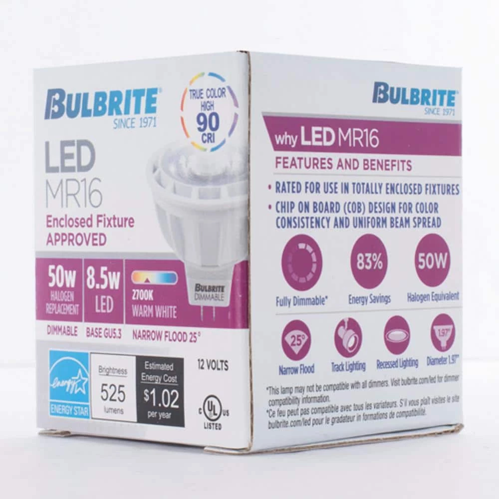 - Specifications: 8.5-Watt, 525-Lumen, 90 CRI, 25000-hour average rated life, bi-pin (GU5.3) base, maximum overall length is 1.87 in. and bulb diameter is 1.97 in.
