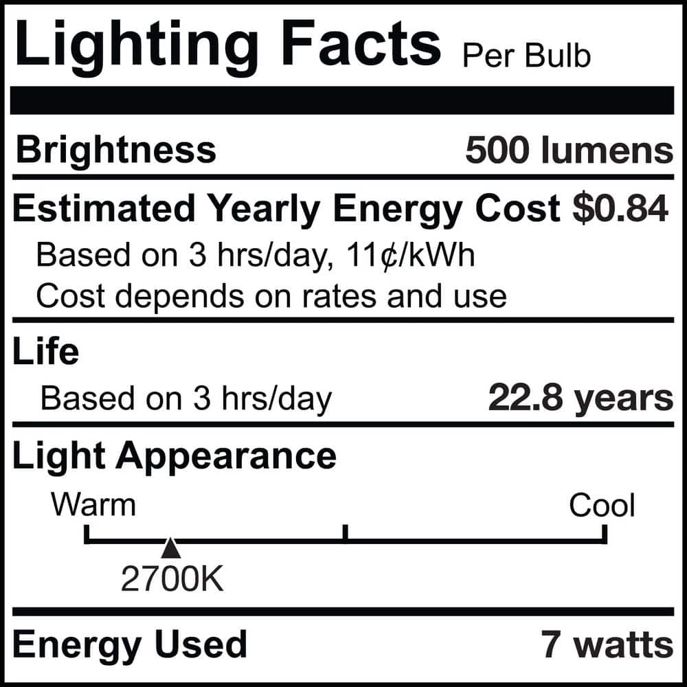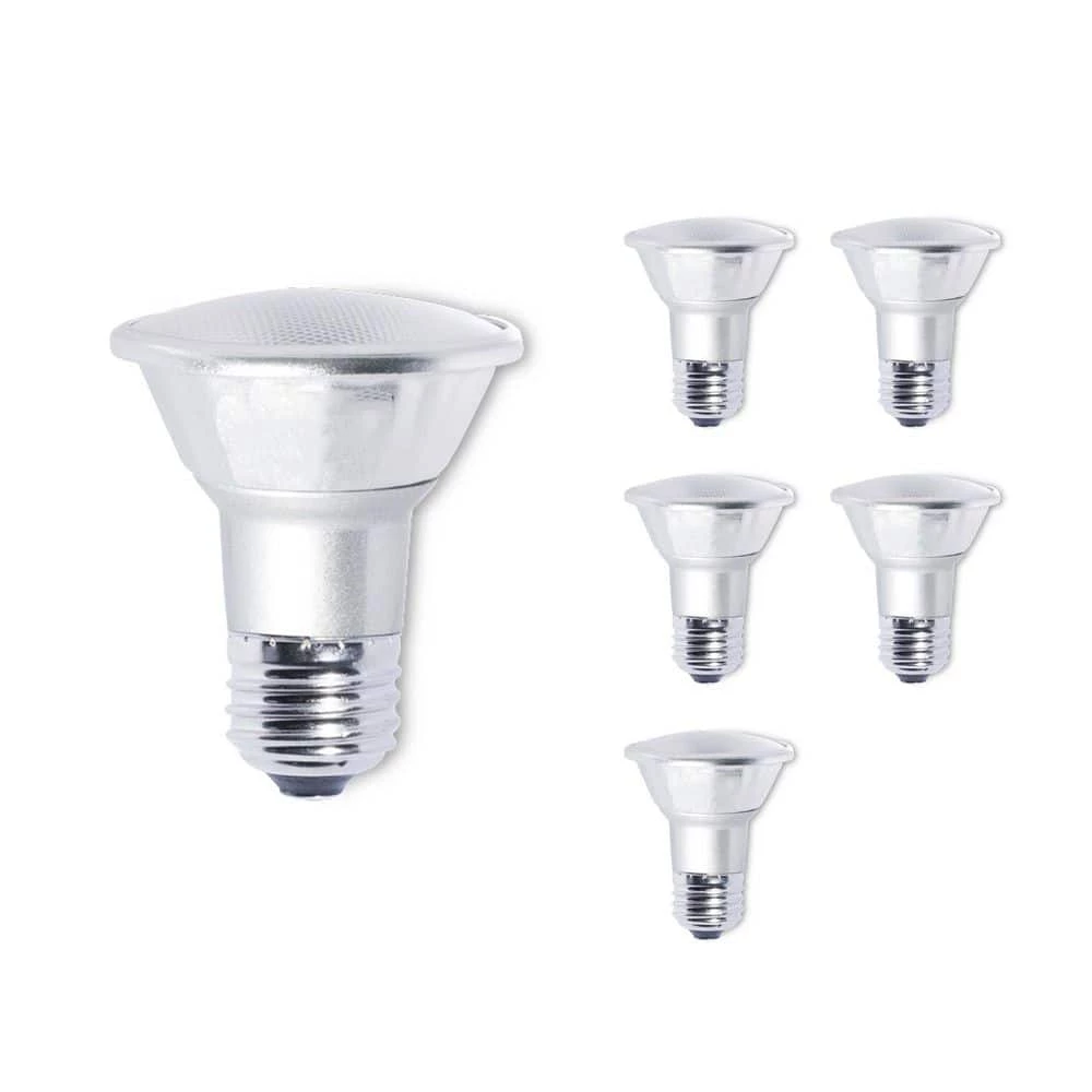Features Pack of (6) bulbs Capable of being dimmed Rated for wet locations Electrical Specifications Bulb Base: Medium (E26) Bulb Type: LED Bulb Shape: PAR20-Wattage: 7-Watts Voltage: 120 volts Lumens: 500 Color Temperature: 2700K Color Rendering Index: 80 Average Hours: 25,000. These LED bulbs utilize the latest in lighting technology, combining energy efficiency and a long life span. These LED bulbs end up consuming up to 90 percent less energy than incandescent bulbs while maintaining bright, reliable lighting.