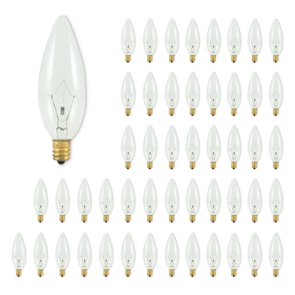 - Specifications: included in the box are 50 individual incandescent bulbs, each bulb is a 60 watt dimmable Torpedo shaped bulb. These B10 bulbs have an E12 screw base, they are rated at 2700K with a clear finish. Dimensions are ‎3.88 x 1.25 x 1.25 inches.