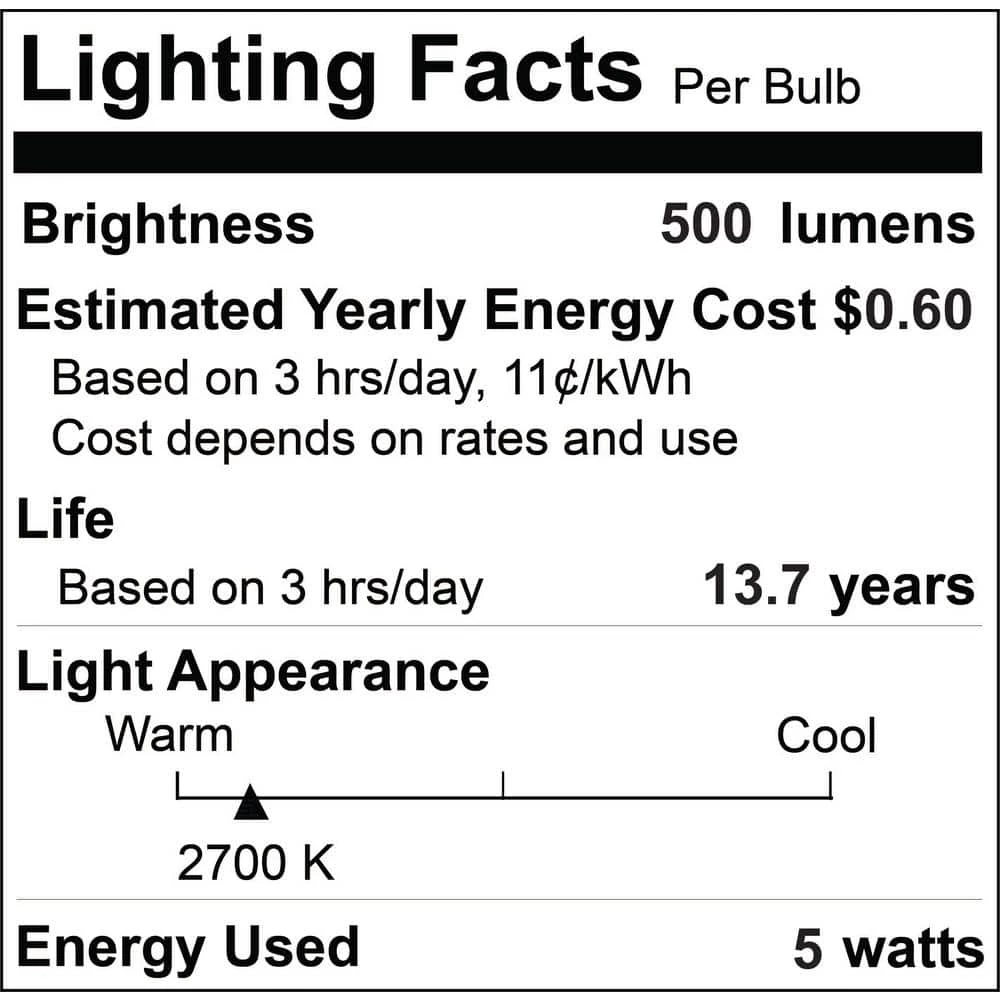 Features Pack of (4) bulbs Capable of being dimmed Rated for damp locations Electrical Specifications Bulb Base: Candelabra (E12) Bulb Type: LED Bulb Shape: B11-Wattage: 5-Watts Voltage: 120 volts Lumens: 500 Color Temperature: 2700K Color Rendering Index: 80 Average Hours: 15,000. These bulbs have a milky finish for even lighting.