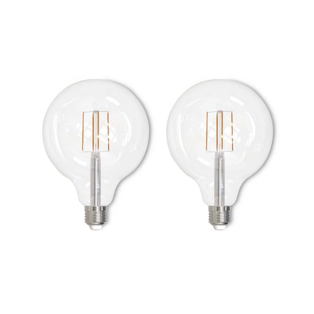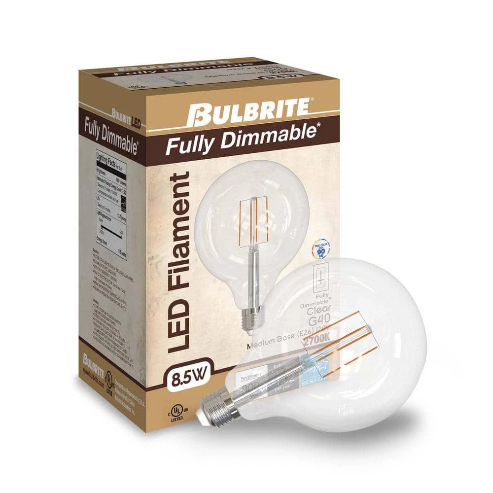 - Specifications: included in this package are two individual LED bulbs with a standard E26 screw base, each bulb is 8.5 watts with 800 lumens, 2700K and 90 CRI. These G40 medium bulbs are clear glass and fully dimmable