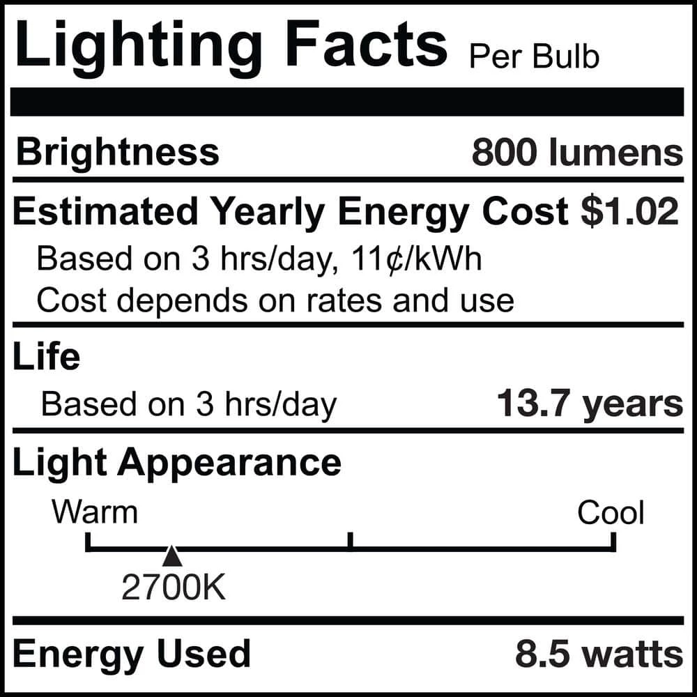 - LED TECHNOLOGY: All 800 lumens shine bright at only 8.5-Watts (60-Watt incandescent bulb equivalent!) These bulbs last an estimated 7.5 times more than their incandescent and halogen counterparts. A 90 percent energy savings lasts over these bulbs’ 15,000 hour lifespan.
