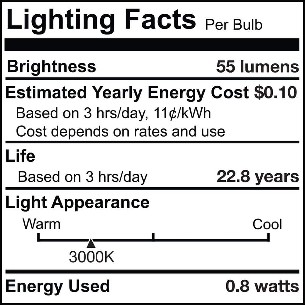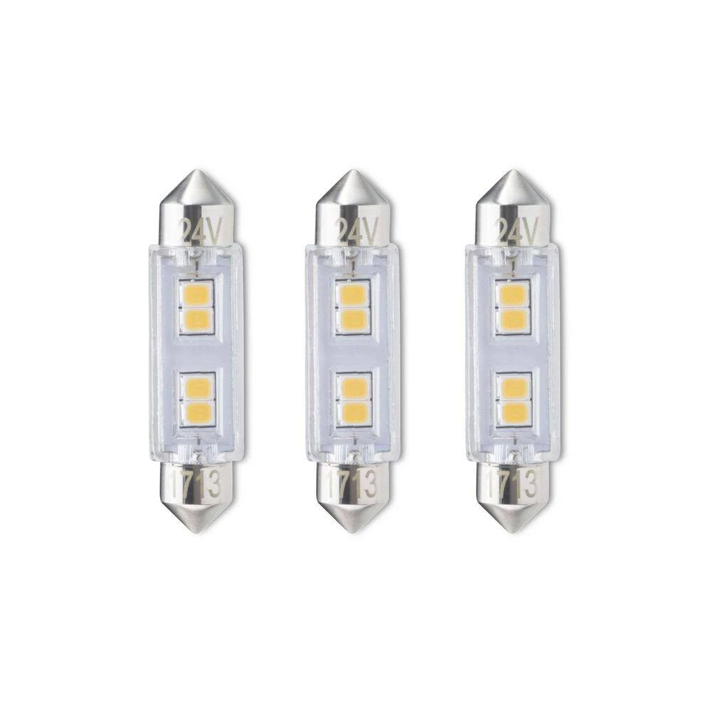 - Specifications: included in this package are three individual mini T3 bulbs, these bulbs are non-dimmable with a festoon base, these 24V light bulbs are .8 watts each but the equivalent of a 20 watt bulb, they have a 3000K rating, 55 lumens and 82 CRI for a Soft white light.