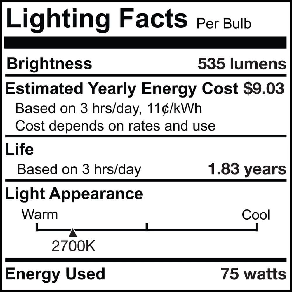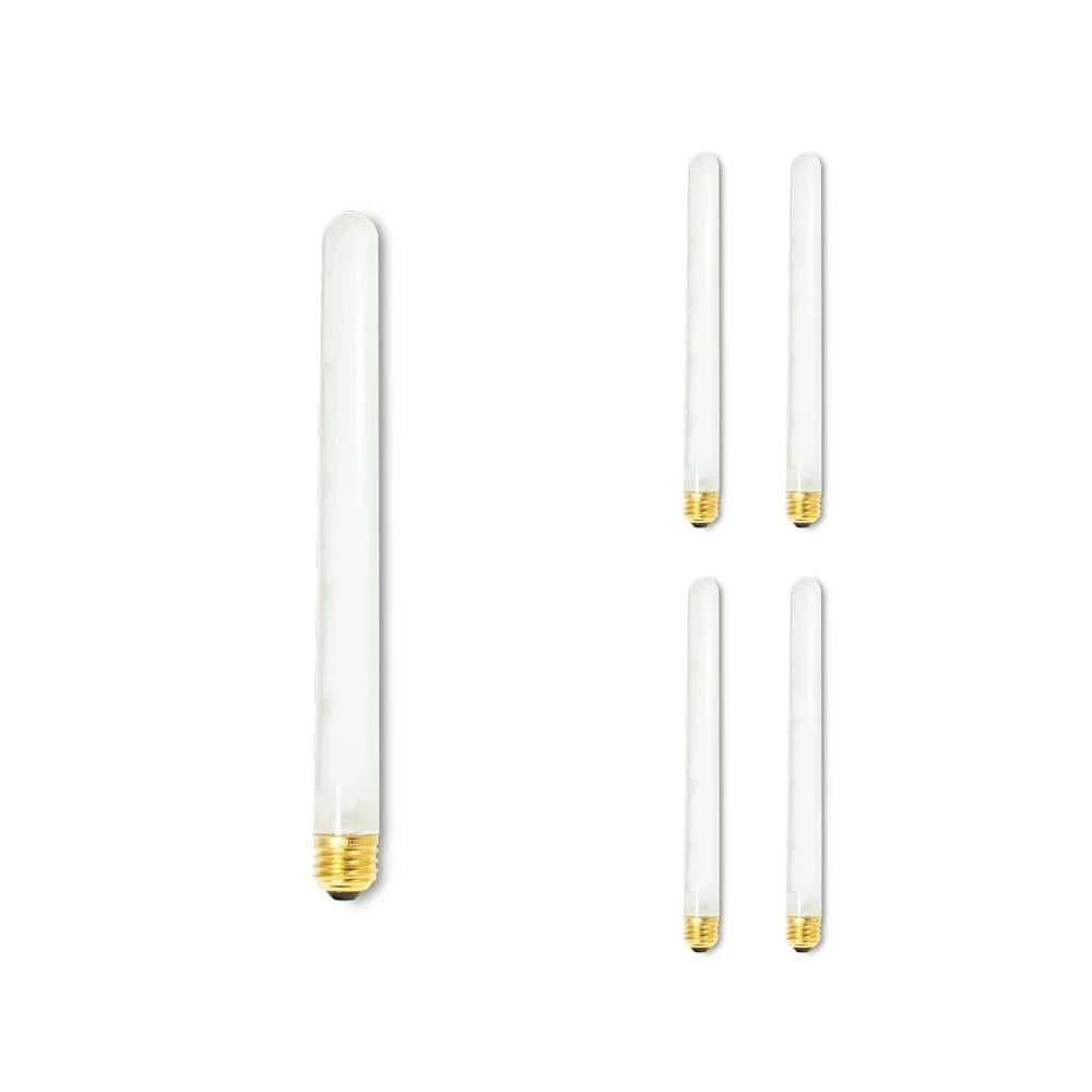 Included in this box are five individual 75-Watt T8 bulbs. Each bulb has a medium E26 screw base. Inspired by the beauty found in everyday things, this collection is oversized to create a strong visual element in any decorative lighting application in your home or business. With a Kelvin score of 2700 each, these bulbs emit a warm white light. They are fully dimmable and their finish is frosted glass for a diffused lighting effect.
